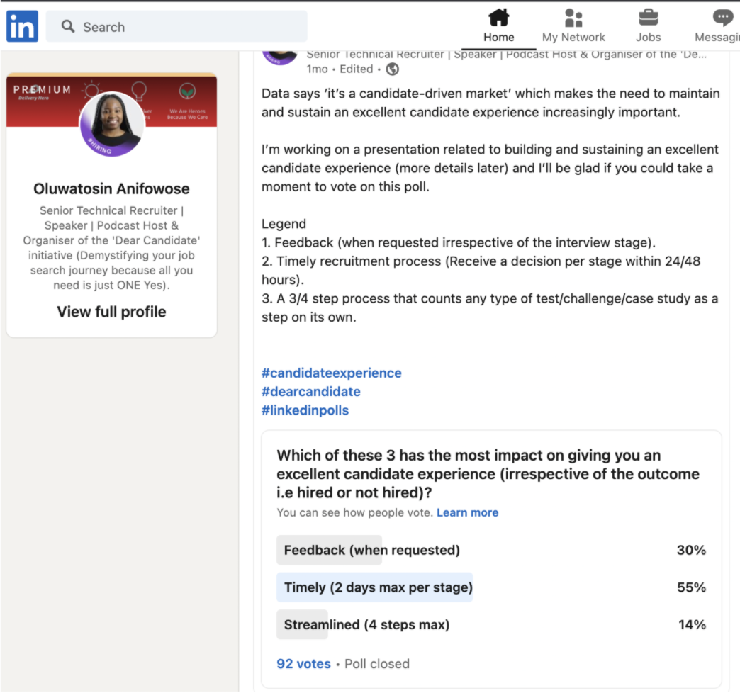 Therefore in my poll, I decided to ask candidates which of these 3 matters to them most. From the results, we see that 55% of the 92 participants that voted, all decided for a timely recruitment process (which is defined as a process that reveals the decision per stage within a 24 to 48 hour period).